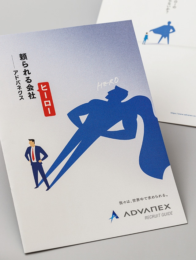 パンフレットの表紙に起用したのは、”頼れるヒーロー”として擬人化したビジネスパーソン。次世代で社会インフラのメインとなる自動車・OA・医療・航空宇宙の分野で活躍する理系学生へそのヒーローを求めたのです。