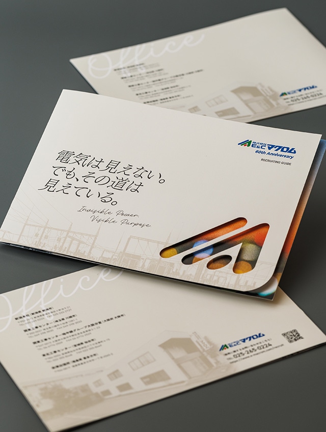 同社のリクエストである営業と採用の両シーンで使えるように構成、両シーンを二つのオブジェクトに見立て、パンフレット表紙で表したのです。