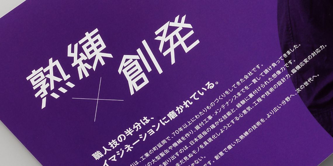 - 企業のスケール感や技術の創造性を表すため、A4横使いを採用、印刷ではグレーイッシュなトーンの箇所を特色シルバーインキにて表現力を高めた。