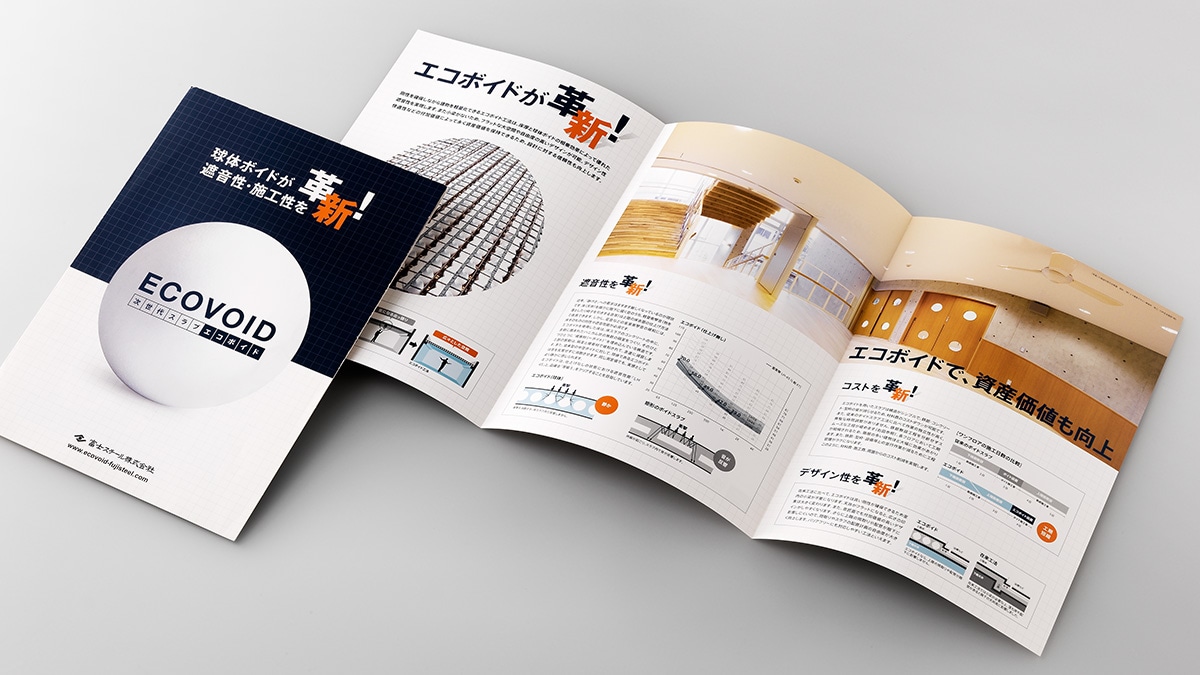 この新事業BtoB-Webをターゲットへリーチする基幹媒体とし、その反響から同社様の営業パーソンがセールス活動に赴くプロセス。その反響ターゲットとの商談の席上で、セールスツールとして使用する「製品パンフレット」(下画像)とのリレーションで、このエコボイド新事業を軌道に乗せる支援となりました。