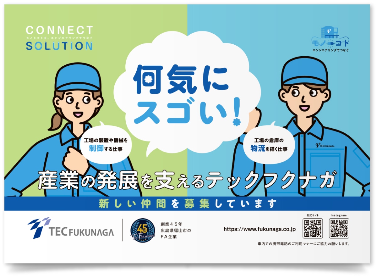 工場内装置や生産ラインの自動化を支えるFAエンジニアリング企業。以前当社で制作した会社案内のデザインテイストを踏襲しつつ、採用を意識した中吊りポスターを制作しました。