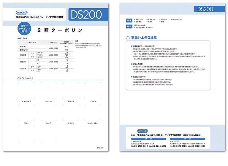 ターポリン素材の現物貼付のサンプル帖カタログです。バインダーファイリング用に、強度の高い用紙に2穴と折スジを入れています。