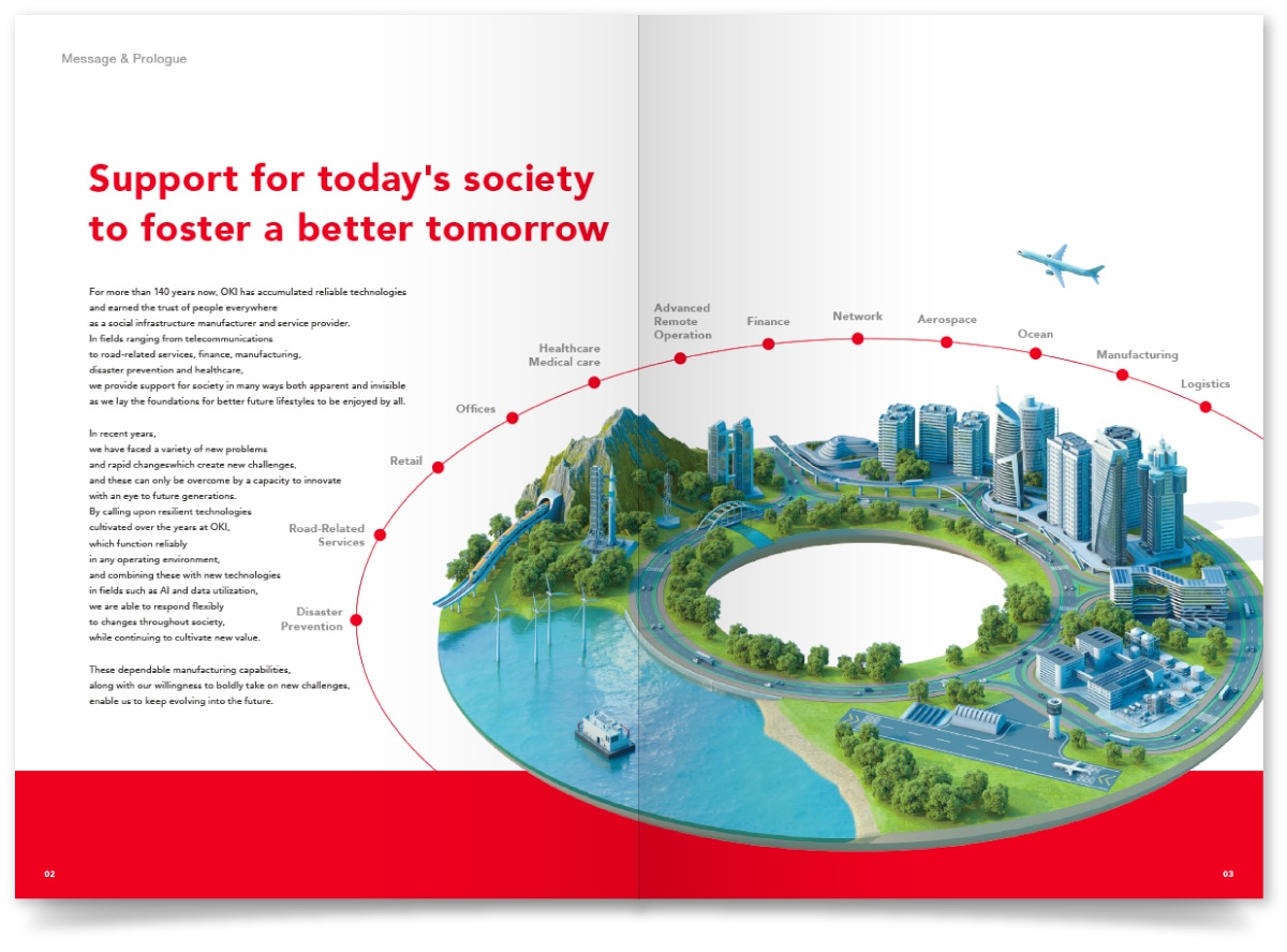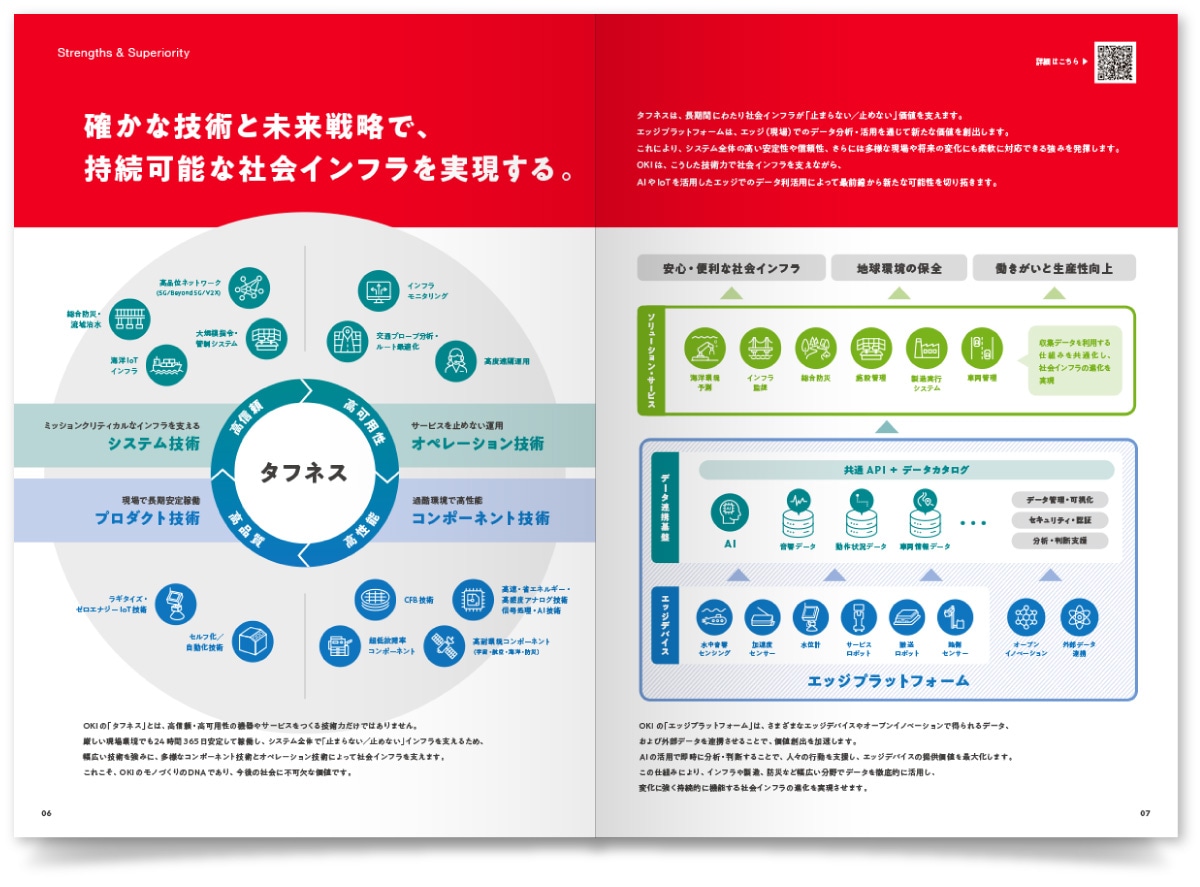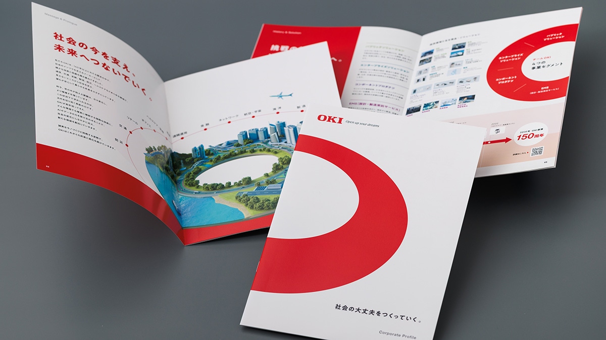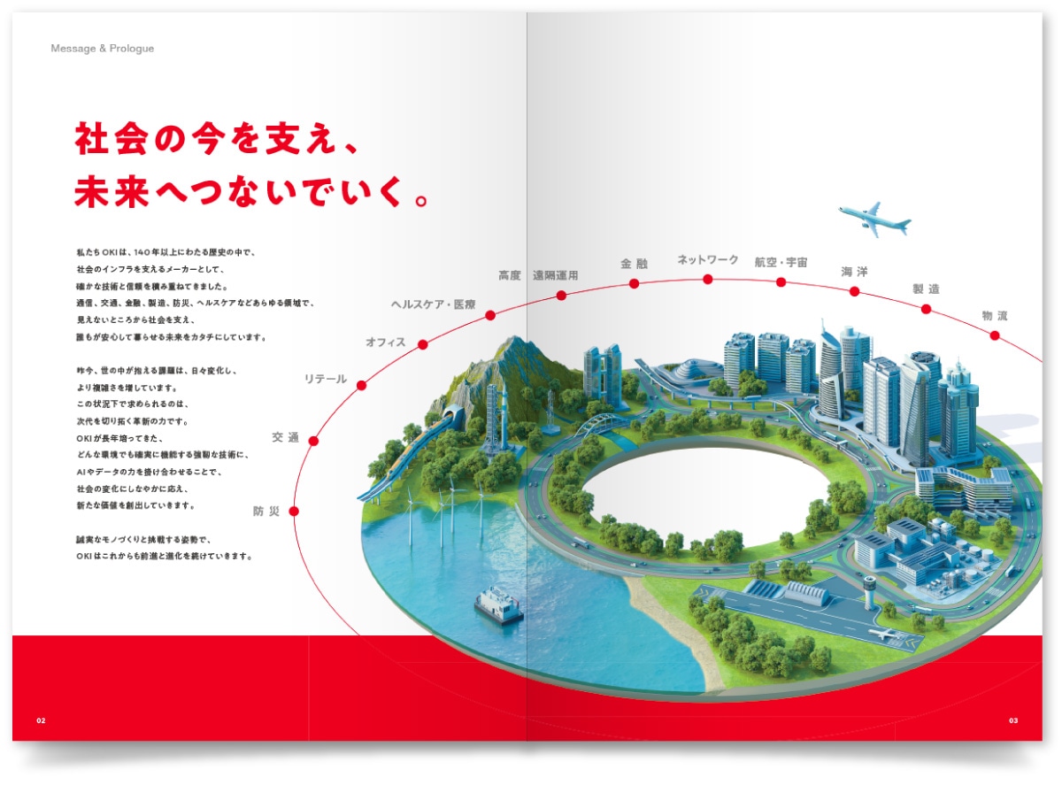 デザイン面では、コーポレートカラーである赤を「OKIの赤」と「日本の赤」に重ね合わせ、グローバルに羽ばたく企業像を象徴的に表現。シンプルかつ力強いビジュアル構成で、国内外のステークホルダーに伝わるOKIらしさを体現する会社案内へと刷新しました。