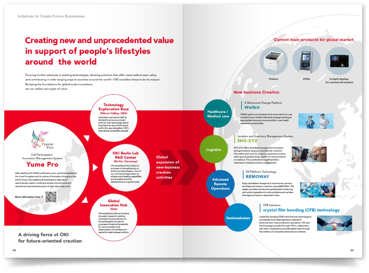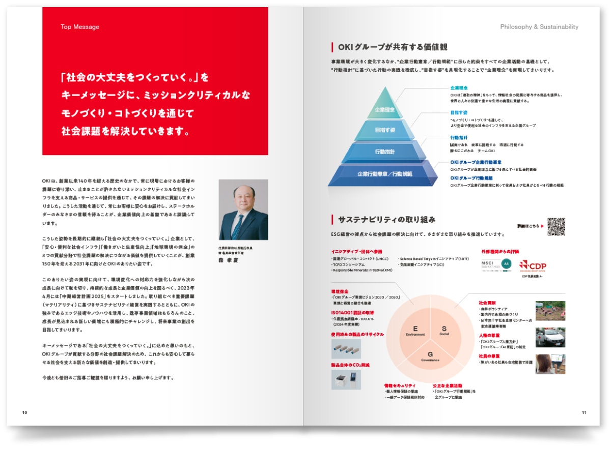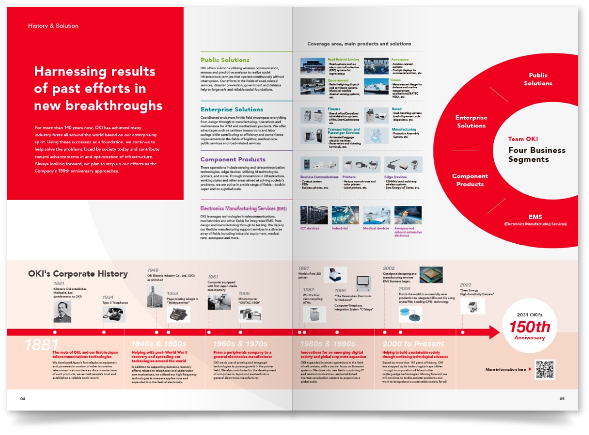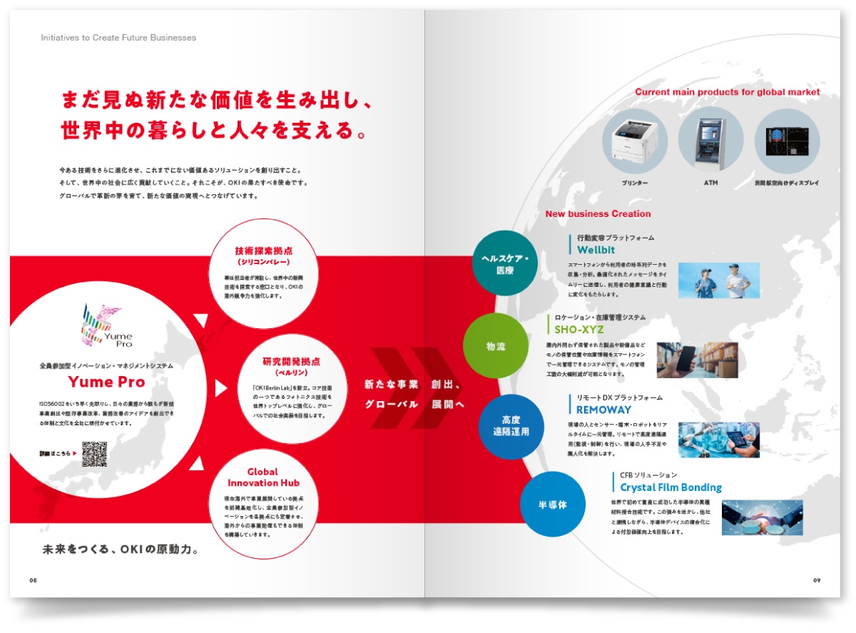 デザイン面では、コーポレートカラーである赤を「OKIの赤」と「日本の赤」に重ね合わせ、グローバルに羽ばたく企業像を象徴的に表現。シンプルかつ力強いビジュアル構成で、国内外のステークホルダーに伝わるOKIらしさを体現する会社案内へと刷新しました。