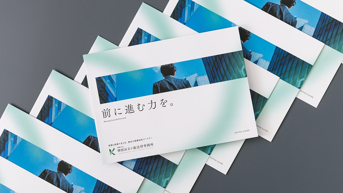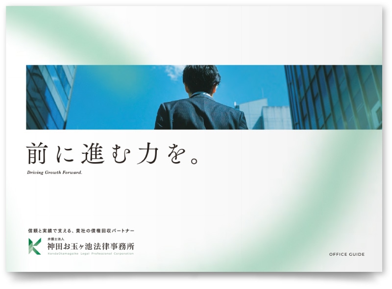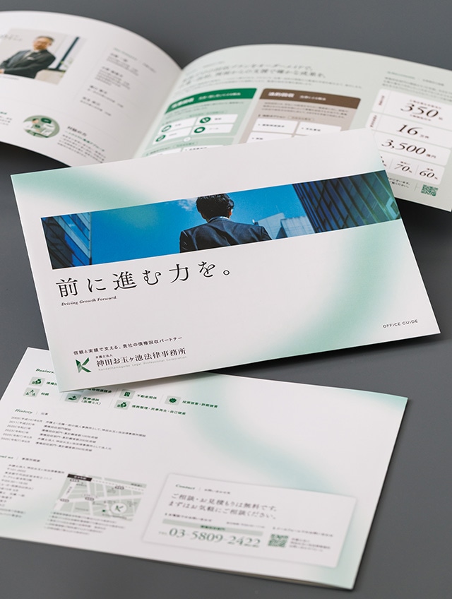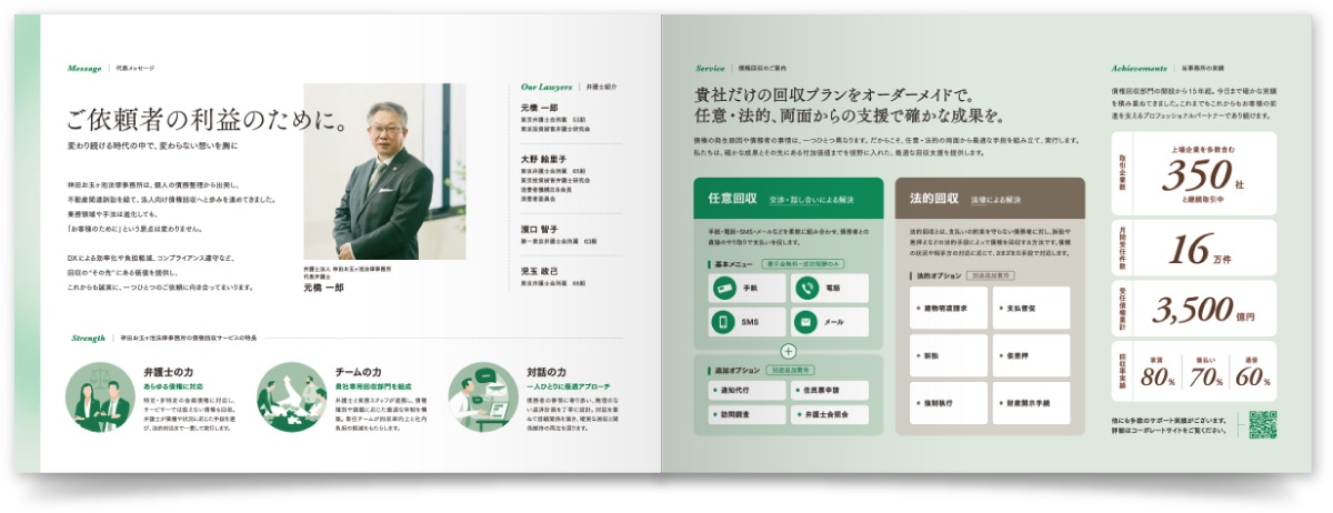 債権回収に強みを持ち、企業の法務課題を解決する法律事務所《東京》の会社案内制作事例です。自前の営業資料とは別に、事務所の姿勢や想いを丁寧に伝えることを目的に制作。代表挨拶から始まる構成で会社案内然としたトーンにまとめました。中面では、事務所の強みやサービス概要をわかりやすく掲載しています。