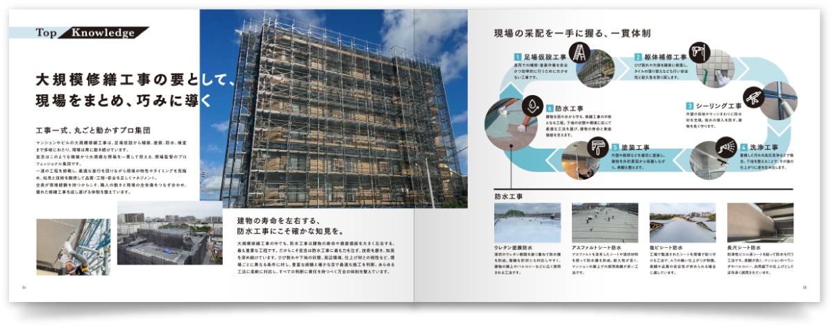同社の強みは、現場監督を中心とした一貫体制。大規模修繕工事において、足場仮設から外壁補修、防水・塗装までを横断的に統括し、現場全体を俯瞰しながら品質と工程をコントロールできる点にあります。本制作では、こうした強みを「現場の不安を一手に握る一貫体制」として整理し、複数工種にまたがる業務範囲や施工の流れを視覚的に伝える構成としました。