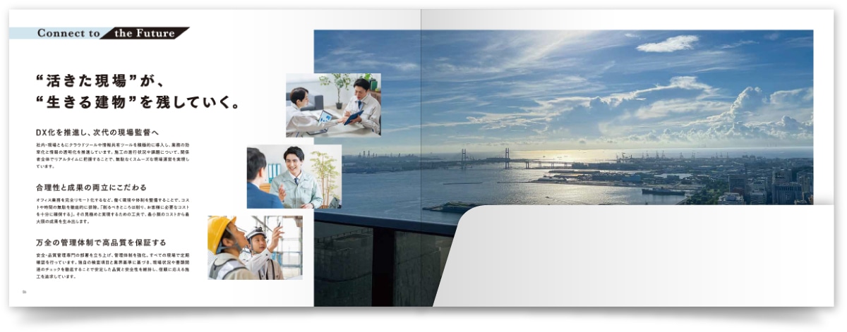 デザインは白を基調に、余白を活かしたレイアウトとし、同社ならではのフレッシュさと誠実さを表現。初の会社案内において求められる"信頼の土台づくり"と"営業ツールとしての機能性"を両立した、会社案内の制作事例です。