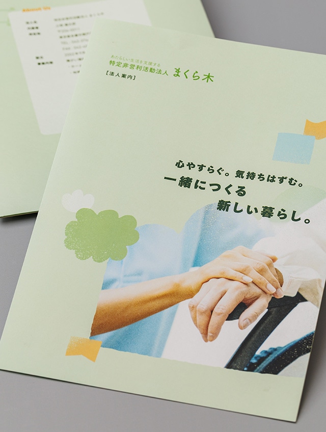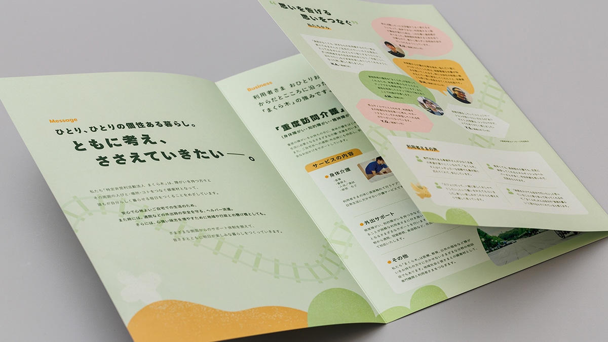 デザイン面では、まくら木の名称にちなんだ"線路"のビジュアルモチーフを用い、やわらかな色調でストーリー感を演出。「寄り添い」「共に生きる」という同法人の想いが、ご利用者とご家族に印象的に伝わる構成としました。