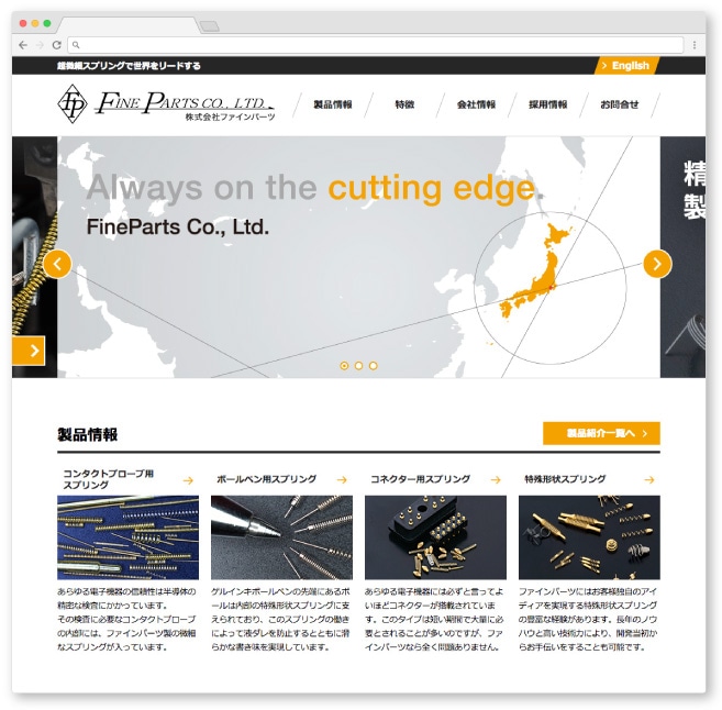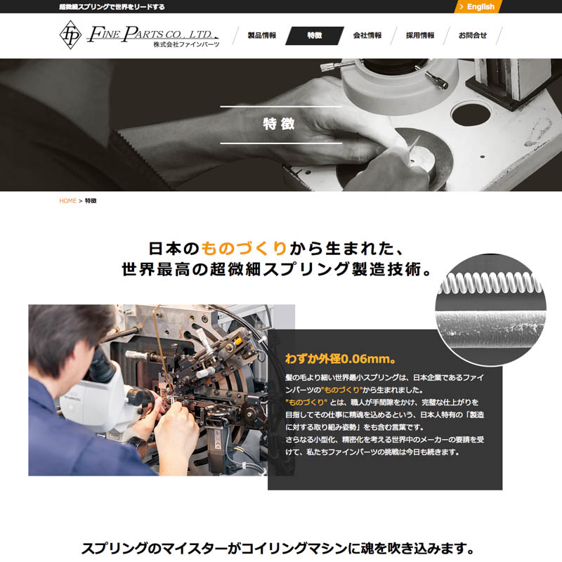 日本のものづくりから生まれた、超微細スプリング製造技術で世界をリードするファインパーツ様の企業パンフレットとオフィシャルサイトの制作事例です。同社様のこれからの海外展開を考慮し、世界地図を用いて信頼性の高い「日本生まれの技術」を表紙やWEBサイトのTOPページで訴求しています。デザインを統一し英語表記を交えたコンテンツは、製品の強みや要点を簡潔にまとめユーザーに特徴が理解しやすい媒体に仕上がっています。