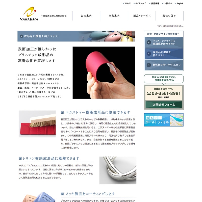 製品やパッケージへの高輝度・高光沢加飾事業、軟包装資材を強みとするパッケージ事業を中心に事業展開をしている企業の会社案内・Webデザインの制作事例です。会社案内では、金属箔と金属粉を"輝き"の素材として印刷業界のお客様に使用していただいていることから印刷加工を工夫しました。箔部分に多彩な色の輝きを持たせることができ、単なる金箔や銀箔にはない「多色メタリック」を実現し、高級感を表現することができる、コールドフォイル加工を採用。オフィシャルサイトではユーザーのニーズに絞った導線を設置し営業効果を高めました。また、コールドフォイルのコンテンツを設け会社案内との相乗効果が期待できるWebに仕上げています。