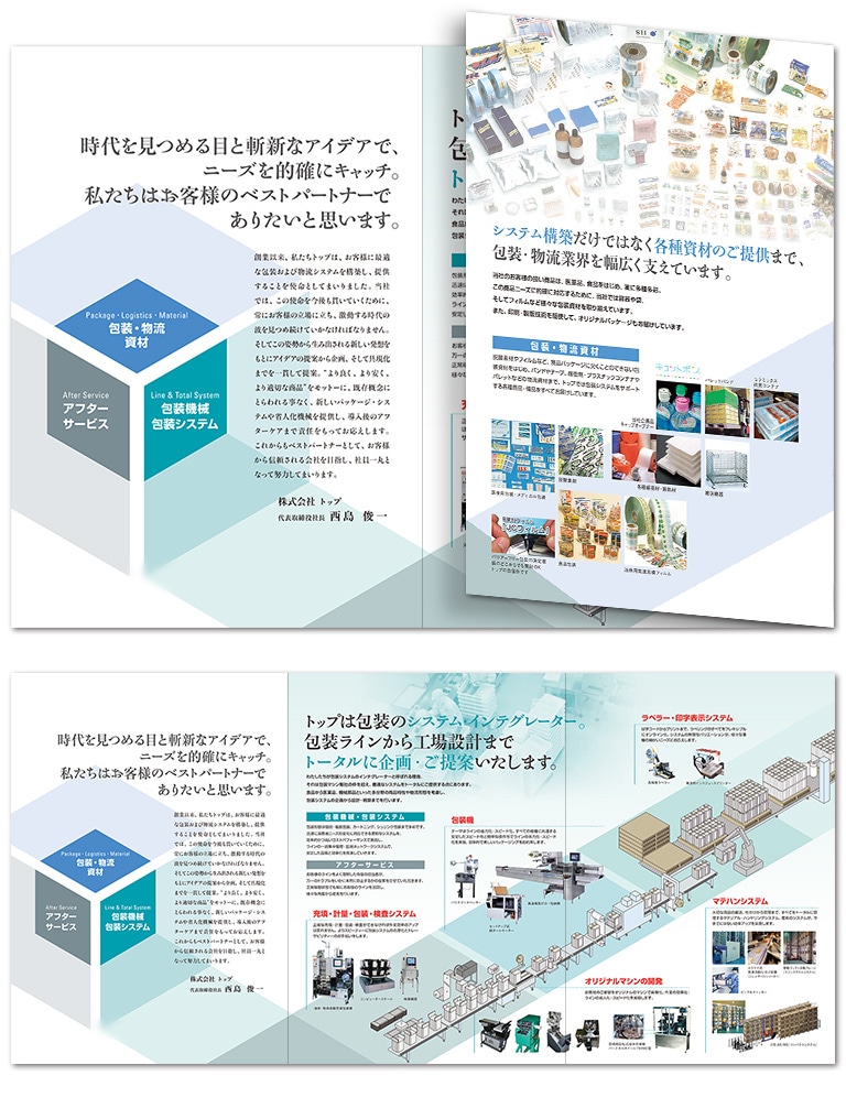 会社案内では6ページ構成の観音折り会社案内ですが、同社様のビジネスモデルを大きくダイナミックにイラストデザイン化し、Webも含めて製品の供給、システム導入から取引後のメンテナンス、サポートまでの上流から下流まで一貫した、包装資材のトータルプランナーであることを、明確に主張する会社案内とWebサイトのコンテンツとデザイン制作事例です。