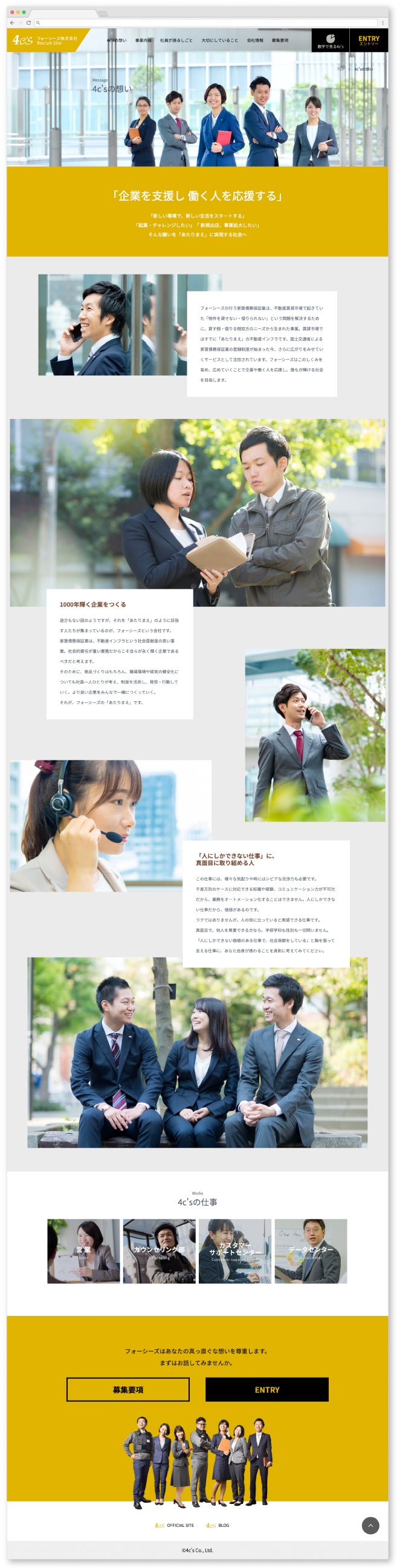 弊社では、採用サイトとパンフレットを同時に制作させていただきました。今回は3度目のリニューアルでしたが、前回と主軸は変えず、企業理念への共感を高める内容に徹しました。同じ企業理念でも、使う言葉や見せ方を変え、その年の状況や学生の思考に合わせた構成にしています。