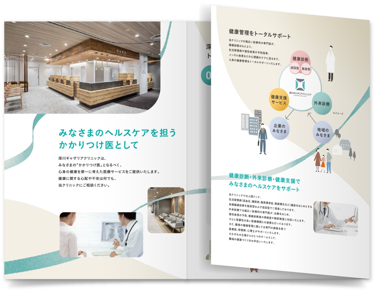 なんでも相談できる「かかりつけ医」を合言葉に、健康診断・予防・外来診療までを一貫して提供しているクリニック。企業向けに健康診断の受診をご案内する営業パンフレットを制作しました。