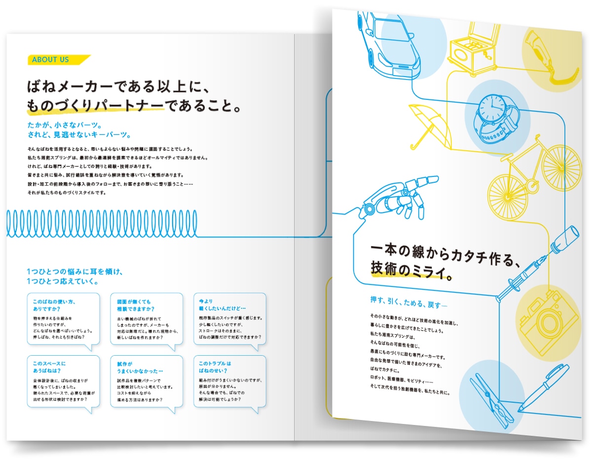 デザインの核に据えたのは、「一筆書きで描ける形状は、すべてばねで実現できる」という力強いメッセージです。このコンセプトを視覚化するため、誌面全体を一本の線が縦横無尽に駆け巡るダイナミックなビジュアルを採用。自転車やロボットアームなど、ばねが組み込まれる多様な製品イメージを一本の線で繋ぐことで、同社の技術が持つ無限の可能性と、あらゆる課題に応える柔軟性を象徴的に表現しました。