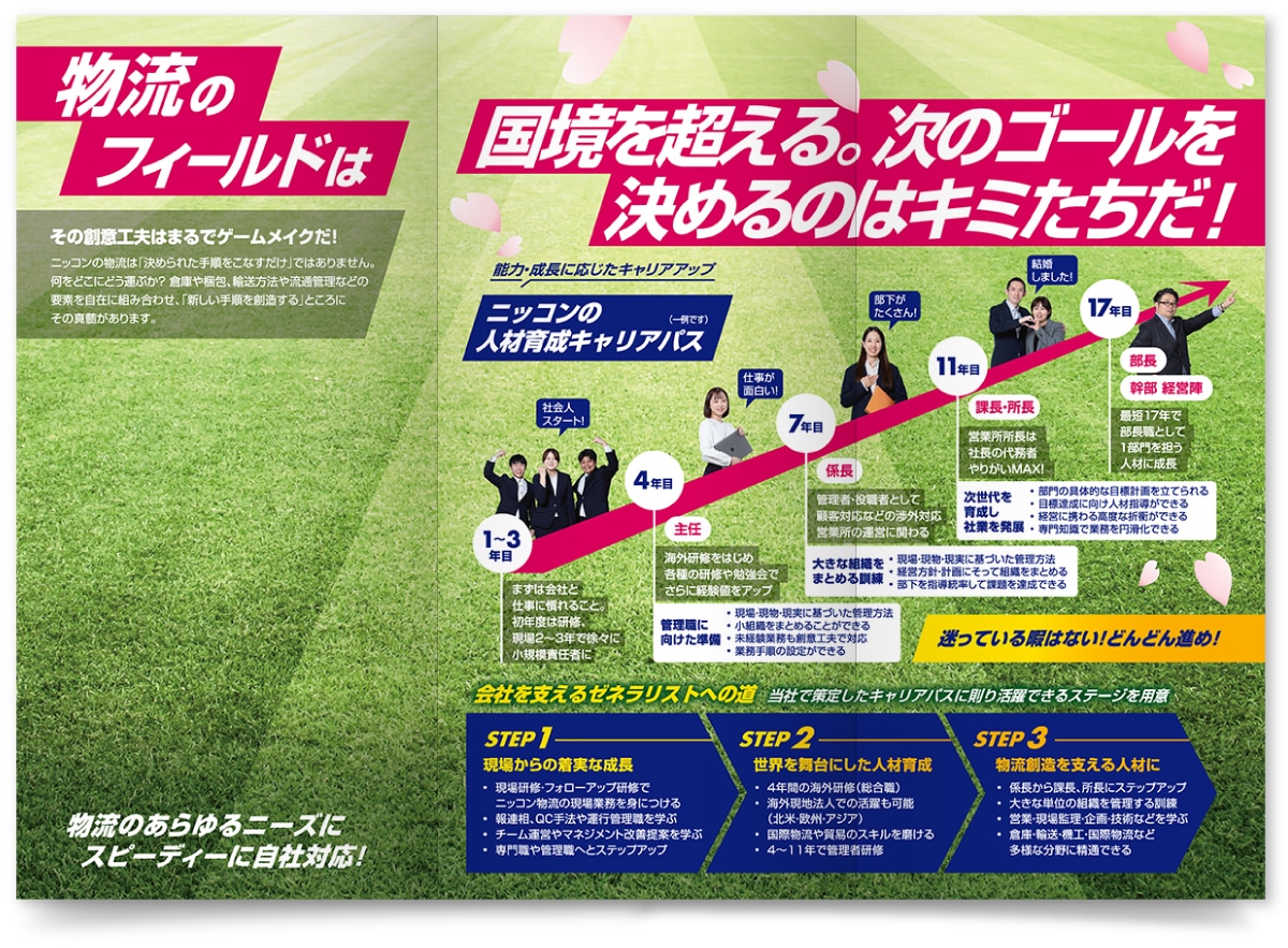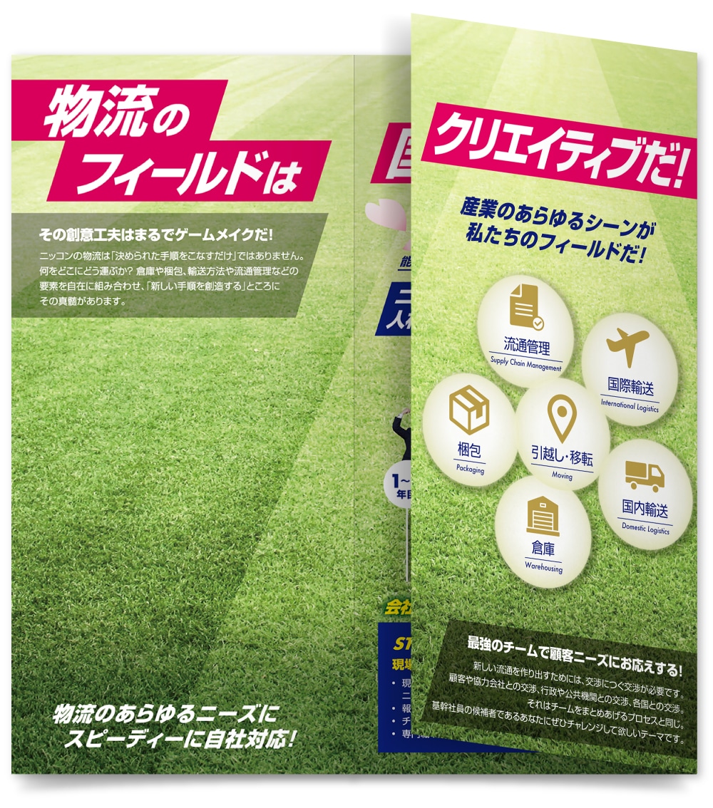 本パンフレットでは、その仕事の本質を"ゲームメイク"と捉え、「物流はクリエイティブである」というメッセージを軸に設計。大阪を拠点とするサッカーチームのスポンサーである背景も踏まえ、チームで戦い、状況に応じて最適解を導く仕事としての魅力を、直感的に伝える構成としました。