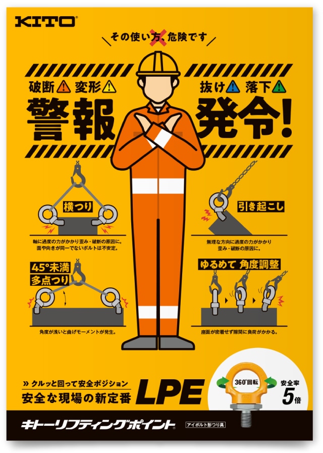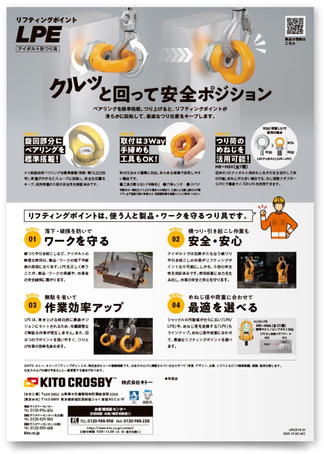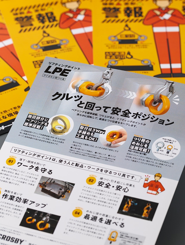 マテリアルハンドリング機器のリーディングカンパニーとして、世界有数のシェアを誇る大手企業。同社が新たに開発した固定具「キトーリフティングポイント」の製品リーフレット制作実績です。