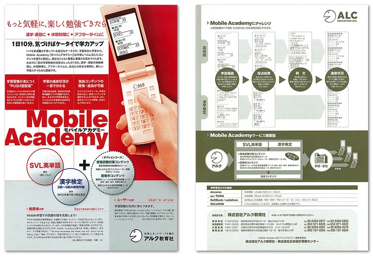 携帯電話の特性を活かした学習コンテンツ配信サービスのリーフレットです。QRコードからデモサイトを訪問できるクロスメディア展開を採用し、本広告1枚で完結しないメディアミックスのノウハウを投入した自由度の高いプロモーションをご提案しました。